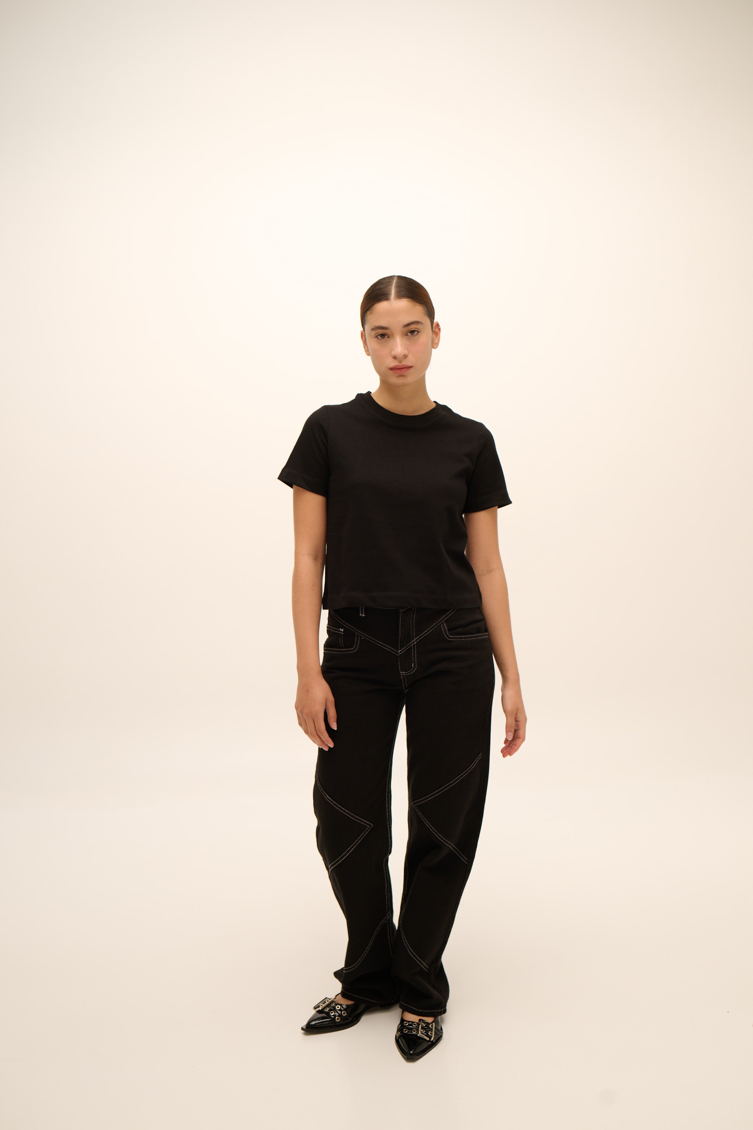 The Cowgirl Jean in Black feature a relaxed fit that effortlessly blends comfort and style. This jeans showcase white contrast stitching in a unique angular pattern resembling a cut-out star across the legs. These pants are a standout piece for any wardrobe.