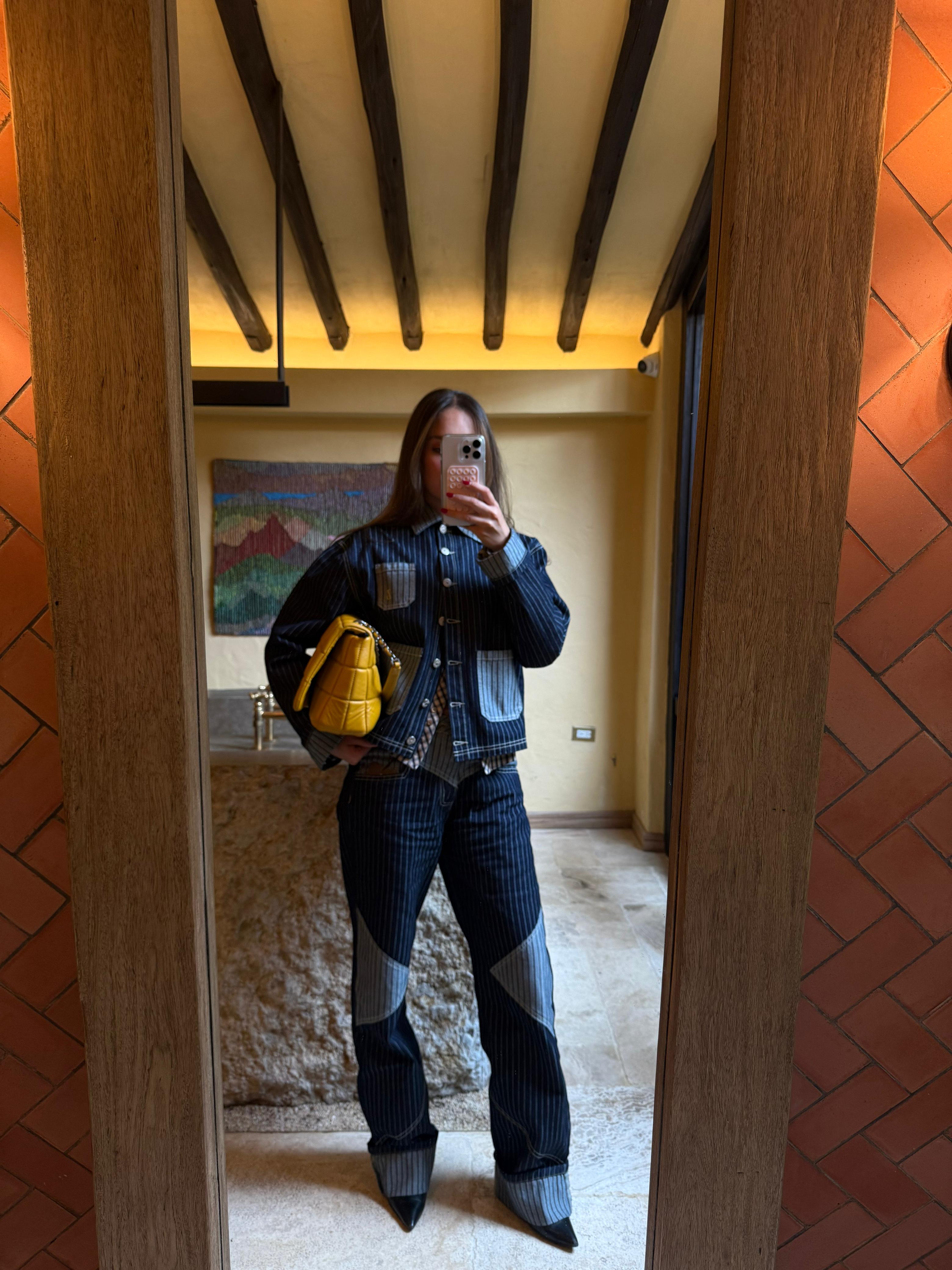 The Cowgirl Jean in Blue Stripes sits at a mid rise with a straight leg. Designed to fit true to size — we recommend sizing up if you prefer a more relaxed, laid-back look.