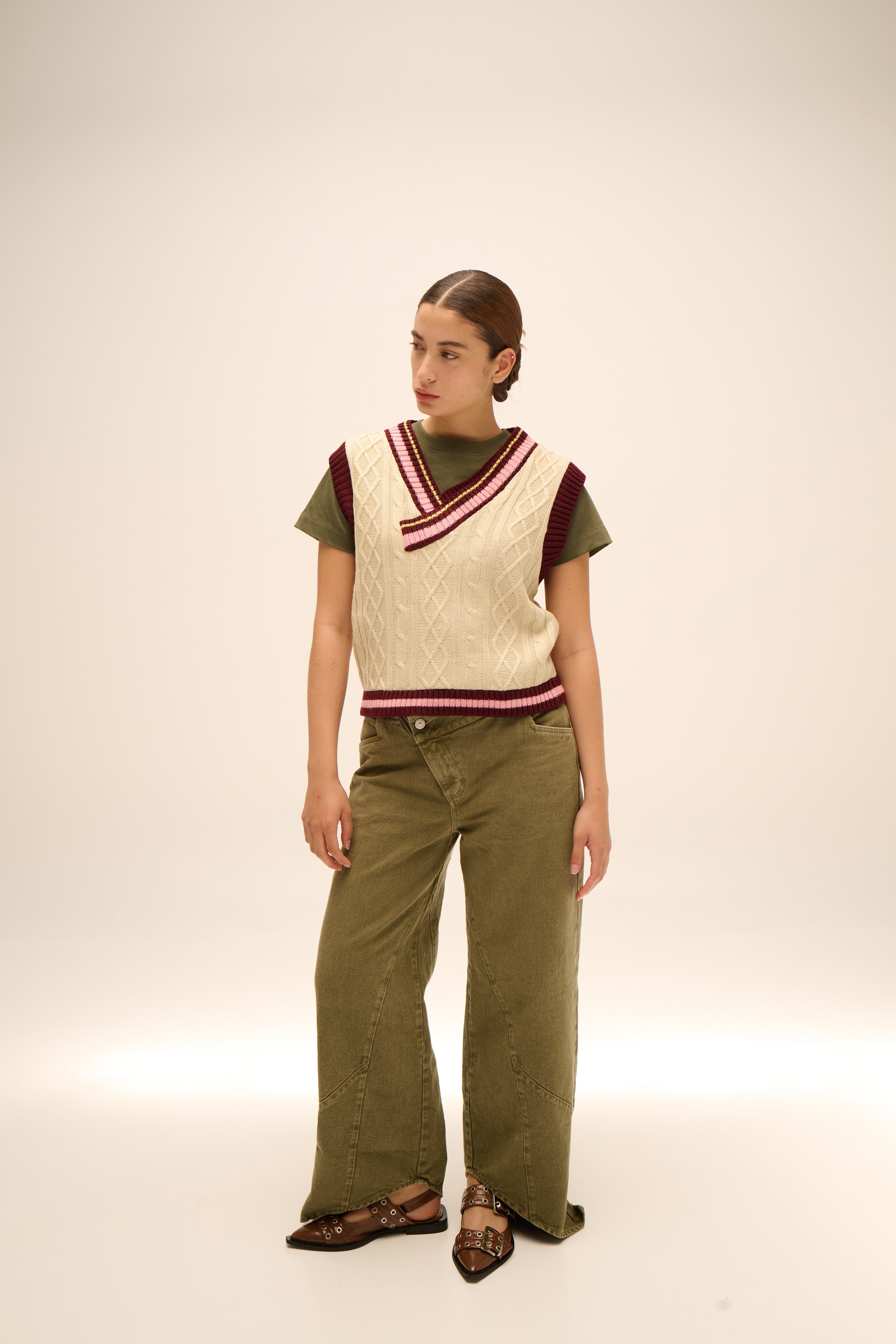 A preppy V-neck knit in cream, edged with burgundy and soft pink trims. Slim through the body, it layers seamlessly over tees or shirts, adding polish without effort. The Lecture Vest carries a collegiate spirit with a refined twist — intellectual, understated, and cool.